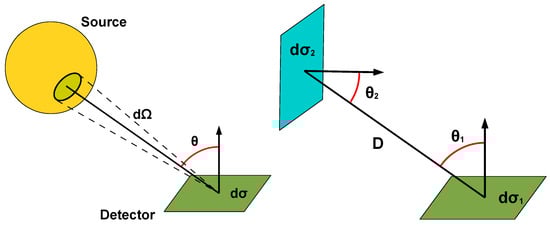 It is useful to start reviewing some basic concepts. For the moment, we ignore the relativistic effects. Let us consider a detector and a source as shown in the left panel in Figure 2. The detector and the source are in empty space, so there is no absorption, scattering, or emission of radiation along the path from the source to the detector. Moreover, the size of the detector, the size of the source, and the distance between the source and the detector are much larger than the wavelength of the radiation emitted by the source, so we can use the ray optics approximation, where the radiated energy flows in straight lines. is the angle between the straight line connecting the detector and the source and the normal to the surface of the detector. The energy illuminating the infinitesimal surface of the detector from the solid angle in the time and in the frequency band of width is