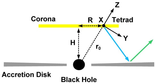 Since the disk is cold and the corona is hot, thermal photons from the disk (red arrows in Figure 1) can inverse the Compton scatter off free electrons in the corona. The spectrum of the Comptonized photons can be normally approximated well by a power law with a low- and a high-energy cutoff [,,]. A fraction of the Comptonized photons (blue arrows in Figure 1) can illuminate the disk: Compton scattering and absorption followed by fluorescent emission produce the reflection spectrum (green arrows in Figure 1).