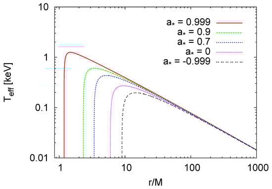 - Page, D.N.; Thorne, K.S. Disk-Accretion onto a Black Hole. Time-Averaged Structure of Accretion Disk. Astrophys. J. 1974, 191, 499–506. [Google Scholar] [CrossRef]