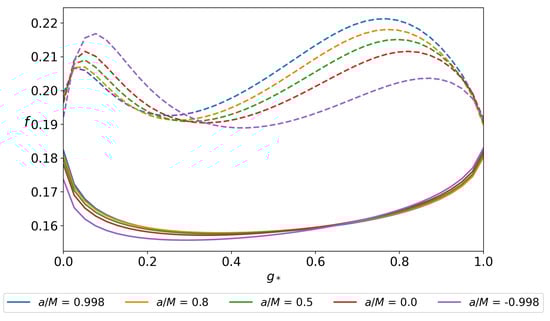 The presence of magnetic fields can make the model significantly more complicated. General Relativistic Magnetohydrodynamic (GRMHD) simulations can provide the most reliable description of the accretion process onto compact objects, even if current simulations still rely on a number of simplifications, so caution is necessary when we want to derive conclusions for the accretion process on astrophysical black holes, and the morphology of magnetic fields around black holes is still poorly understood. Current GRMHD studies suggest that thin accretion disks are close to being Keplerian, and the simple model described in Section 2.3 can well approximate the motion of the material in the disk region []. Magnetic fields can instead affect the motion of the material in the plunging region and change the location of the inner edge of the disk, which may not be any longer. In such a case, Equations (26)–(28) may not well describe the motion in the plunging region. The simplest models to describe the motion of the material in the plunging region in the presence of magnetic fields still assume that the motion is on the equatorial plane ( and ) and consider simple modifications in the Lagrangian in Equation (12) to slow down the fall of the material from the ISCO to the black hole.