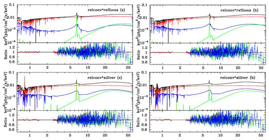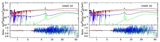 The reflection spectrum in the rest-frame of the material in the disk is characterized by narrow fluorescent emission lines in the soft X-ray band and a Compton hump with a peak around 20–40 keV [,]. The strongest emission feature is often the iron K complex, which is a very narrow feature at 6.4 keV in the case of neutral or weakly ionized iron atoms and shifts up to 6.97 keV in the case of H-like iron ions. The reflection spectrum of the whole disk as seen far from the source is blurred because of relativistic effects (Doppler boosting due to the motion of the material in the disk and gravitational redshift due to the gravitational well of the black hole) [,,,]. X-ray reflection spectroscopy is the analysis of these relativistically blurred reflection features in the X-ray spectra of X-ray binary systems and active galactic nuclei and can be a powerful tool to study the accretion process around black holes, measure black hole spins [,,], and test Einstein’s theory of general relativity in the strong field regime [,,].