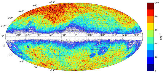 Position density distribution of all quasars in Gaia-CRF3 on the celestial sphere, and the number of sources in the northern hemisphere is obviously more, and the distribution is relatively concentrated. The density distribution of quasars is almost zero at low Galactic latitudes. The total number of sources shown in this figure is approximately 1.61 million.