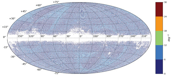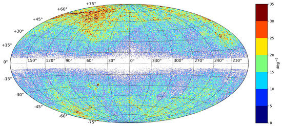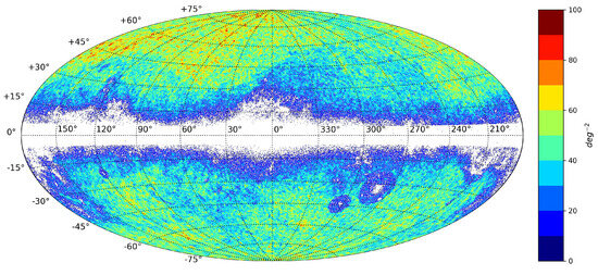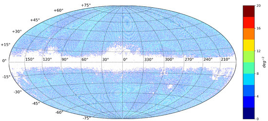 Position density distribution of sources selected using the HEALPix grid on the celestial sphere. Pixels containing only one source have been filtered out, resulting in a dataset with 154,853 sources.