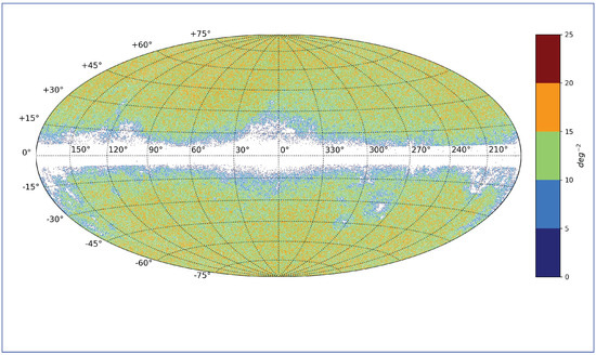 Using the Fibonacci grid, we constructed a catalog with N = 600,000 sources. After cross-matching with the 5-parameters solution using TOPCAT, 432,184 sources were retained. The spatial distribution of these samples across the celestial sphere is depicted in Figure 4. The density distribution of the sources reveals sparse coverage in regions of low Galactic latitude due to Galactic obscuration, particularly near . When the Galactic latitude is less than , the source density decreases significantly. Across most of the celestial sphere, the density is consistently maintained at 10–15 sources per square degree. Small-scale variations are observed due to the cross-verification process using the Fibonacci grid and the 5-parameter solution. In certain localized regions, the density increases to 15–20 sources per square degree. Despite these minor fluctuations, the denser regions remain uniformly distributed across the celestial sphere, confirming the effectiveness of the sampling method.