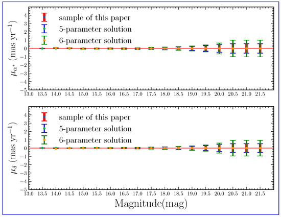 The average proper motion at different magnitudes in Ra and Dec directions from three data sets which is 5-parameter solution, 6-parameter solution and our sample. Within the error range, the average proper motion of the source in different magnitude intervals is 0. When G ≈ 20 mag, the number of sources observed by Gaia is the largest, which is one of the reasons for the large relative error of the proper motion near 20 mag. In addition, too small source brightness may also cause large errors. The proper error of the 6-parameter solution (green) is the largest among the three sets of data; our filtered sample (red) is at the same level as the proper error of the 5-parameter solution (blue).