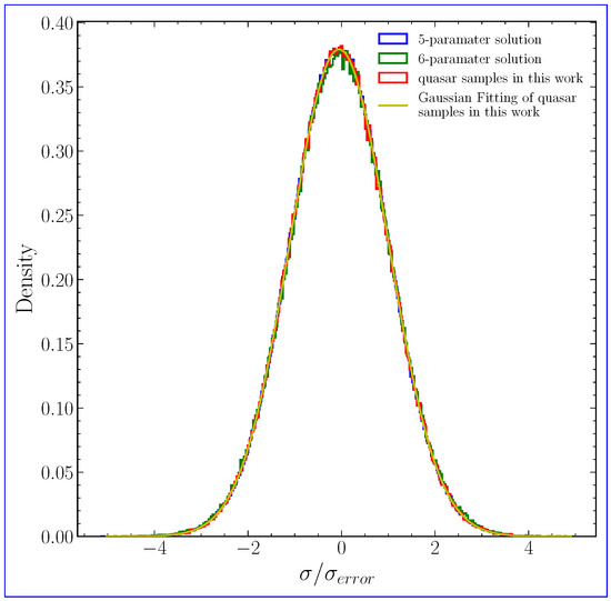 Next, we analyzed the histogram of the parallax divided by its standard error for three datasets: the 5-parameter solution, the 6-parameter solution, and the sample data presented in this study. Figure 6 displays the histograms of these datasets. The distributions are highly similar across all three datasets. The blue histogram represents the 5-parameter solution, the green corresponds to the 6-parameter solution, and the red represents the sample data in this paper. Additionally, the red curve shows the Gaussian fit for the sample data. The histogram of the parallax divided by its standard error in this study follows a nearly normal distribution, with an average value of = −0.05 and a variance of , closely aligning with a standard normal distribution. This result indicates that the independence of the parallax data in the sample after filtering is comparable to that of the 5-parameter and 6-parameter solution data. Furthermore, it demonstrates that the sampling method does not impact the statistical independence of the sampled data.