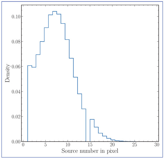 The ’128 pixel’ dataset was generated using the HEALPix pixelization scheme with a resolution parameter of = 128, dividing the celestial sphere into uniformly spaced regions. Each pixel represents a specific area of the sky, and data within each pixel were analyzed individually. The ’128 pixel-sources No > 1’ dataset is a refined subset of the ’128 pixel’ dataset, where pixels containing only one astronomical source were excluded. This subset includes only those pixels with two or more sources, ensuring more robust statistical analysis.
