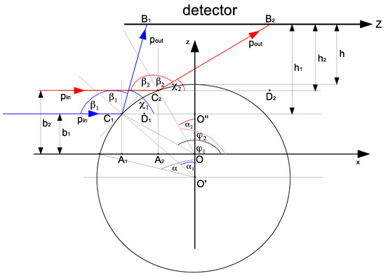 Thus, the endpoints of the interval on the Z-axis are shifted with respect to points and , which correspond to the maximal and minimal scattering angles, respectively. These shifts are calculated as follows: