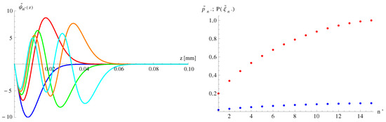 (left) Wave functions of first five quantum gravitational states of ultracold neutrons in the spatial region . (right) The probabilities (blue dots) and (red dots) to find the –quantum gravitational state of ultracold neutrons in spatial region II.