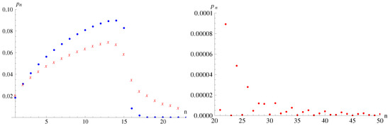 The probabilities (blue dots) to find a n–quantum gravitational state in the mixed state with (left), compared to the probabilities from the paper by Ichikawa et al. [27] (red crosses). The probabilities (right) show random oscillations for , which were not obtained by Ichikawa et al. [27].