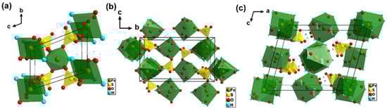 Melanterite is a mineral composed of hydrated iron sulfate with the chemical formula FeSO4⋅7H2O (Figure 1c). The crystal structure of melanterite is monoclinic, belonging to the space group P21/c, with lattice parameters approximately a = 14.07 Å, b = 6.50 Å, c = 11.04 Å, and β = 105.6° []. The crystal structure of melanterite is formed by a SO4 tetrahedron, two independent M(H2O)6 octahedra (M = Fe1 and Fe2), and one interstitial H2O group which is not directly bonded to Fe2+ cations. Fourteen H-bonds occur, connecting Fe2+ centered octahedra to the SO4 tetrahedra, giving rise to an undulating layer showing the alternation [,].
