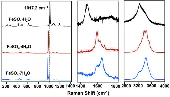 The Raman spectra of three hydrated ferrous sulfates were measured in the range of 100 to 4000 cm−1 (Figure 3; Table 1). These spectra reveal the fundamental vibrational modes of the molecules. In the region from 100 to 1300 cm−1, the vibrational characteristics of the synthesized samples indicate the influence of  tetrahedra, including symmetric stretching (ν1), antisymmetric stretching (ν3), symmetric bending (ν2), and antisymmetric bending (ν4) modes, respectively [,]. The features around 1600 cm−1 and in the range of 3200 to 3600 cm−1 are attributed to the O-H bending and stretching modes of structural H2O, respectively. The modes of structural H2O include symmetric stretching (ν1), antisymmetric stretching (ν3), and bending (ν2) [,]. Table 1 summarizes the Raman features and their assignments for the three hydrated ferrous sulfates. The three hydrated ferrous sulfates have their unique features which indicate that Raman spectroscopy can be used to distinguish them on Mars and Earth from different minerals.