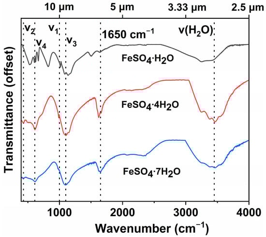 The MIR spectra were acquired to complement the Raman spectra and to identify the MIR vibrational modes of three hydrated ferrous sulfates. The peak positions and assignments for the three samples are detailed in Table 2, and their MIR spectra are shown in Figure 4. Generally, while the MIR peak positions are similar to those of the Raman peaks, MIR peaks are relatively broader. The MIR spectra primarily feature bands in the ranges of 400–1350 cm−1, 1500–2000 cm−1, and 3000–4000 cm−1. The 350–1350 cm−1 range corresponds to the vibrational features of the  tetrahedra, whereas the 1500–2000 cm−1 and 3000–4000 cm−1 ranges are associated with the H2O modes [,]. Similar to Raman spectra, three hydrated ferrous sulfates also have distinct MIR features, which means the MIR features of three hydrated ferrous sulfates can also be used to identify them in different environments.