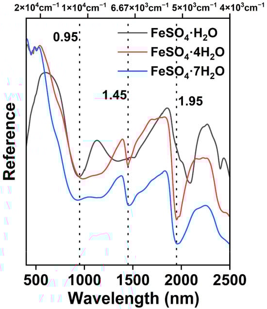 On Mars, various types of sulfate minerals have been identified by different instruments. For instance, CheMin (XRD) have identified Ca-sulfates [], Fe(III)-sulfates [], and Mg-sulfates [] in different members of Gale Crater, while SHELORC (Raman) measurements have detected these sulfates in different sites within Jezero Crater []. In addition, sulfates also have been detected by IR instruments on orbiters and rovers, such as PanCam (UV-VNIR) on the Opportunity and Spirit rovers, OMEGA (Observatoire pour la Minéralogie, l’Eau, les Glaces et l’Activité on Mars Express orbiter) [], and CRISM (Compact Reconnaissance Imaging Spectrometer for Mars on Mars Reconnaissance Orbiter) []. However, many sulfates are still inferred to exist on the Martian surface based on spectral similarities and a lack of reference data. For example, some spectra feature of three hydrated ferrous sulfates synthesized in this study as similar to ferric sulfates. Therefore, the detailed spectral features measured in this study can serve as a database for detecting three hydrated ferrous sulfates on Mars.