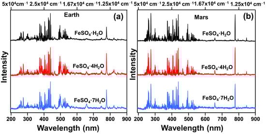 The laser-induced breakdown spectroscopy (LIBS) spectra of three hydrated ferrous sulfates were obtained from (a) the Earth environment and (b) Mars-like conditions.