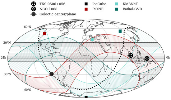 - Aartsen, M.G.; Ackermann, M.; Adams, J.; Aguilar, J.A.; Ahlers, M. Time-Integrated Neutrino Source Searches with 10 Years of IceCube Data. Phys. Rev. Lett. 2020, 124, 051103. [Google Scholar] [CrossRef]