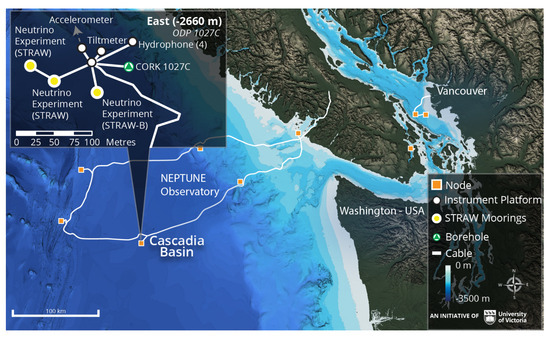 - Bailly, N.; Bedard, J.; Böhmer, M.; Bosma, J.; Brussow, D.; Cheng, J. Two-year optical site characterization for the Pacific Ocean Neutrino Experiment (P-ONE) in the Cascadia Basin. Eur. Phys. J. C 2021, 81, 1071. [Google Scholar] [CrossRef]
