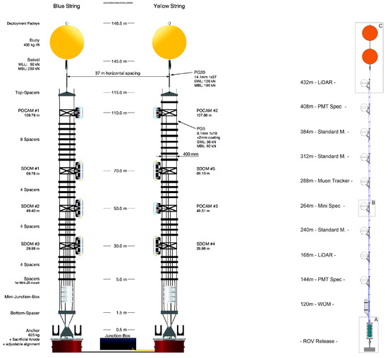 - Spannfellner, C. Design of the Pacific Ocean Neutrino Experiment`s First Detector Line. PoS 2023, 444, 1219. [Google Scholar] [CrossRef]