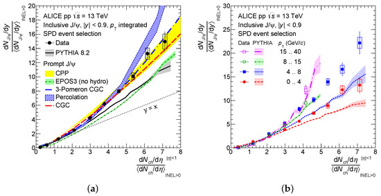 The results are also compared to initial-state models in Figure 1. In the coherent particle production (CPP) model [27], high-multiplicity hadronic interactions are treated on equal footing regardless of the collision system, from pp to AA collisions. The model relies on parametrisation of the mean multiplicities of light and heavy particle production, assuming their linear dependence on binary nucleon–nucleon collisions in pA collisions. This model takes into consideration the possible mutual boosting of the gluon densities and saturation scales in colliding protons [28]. The model is defined for at least one nucleon–nucleon collision, i.e., relative charged-particle multiplicity . The uncertainties on the CPP model are those resulting from parametrisation of the measurements and their corresponding experimental uncertainties. CPP calculations describe J/ results.