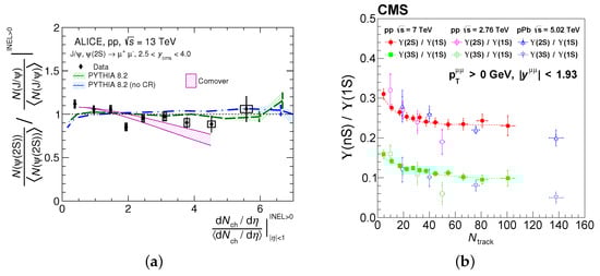 Ratio of to production cross-section in decay. (a) Ratio as a function of charged-particle multiplicity in pp collisions at 8 TeV for both prompt and non-prompt components, at large rapidity for GeV/c [57]. (b) Ratio for prompt contribution in pp and pPb collisions (large rapidity, GeV/c ) and PbPb data (central rapidity, GeV/c [57,60,61].