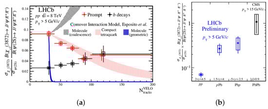 The recent measurement of production as a function of charged-particle multiplicity in pp collisions at TeV by LHCb has attracted the interest of the community [57]. The to production cross-section ratio has been evaluated separately for the prompt and non-prompt contributions as a function of multiplicity for GeV/c; see Figure 4. The ratio decreases as a function of multiplicity for prompt contribution, while the non-prompt ratio does not present a significant variation with multiplicity. Different interpretations have been proposed and are still under debate; see Refs. [58,59]. Authors from Ref. [58] consider that if the structure of the hadron is that of a compact tetraquark, its evolution with multiplicity is governed by the interactions with comoving particles with similar rapidities, in the so-called comover interaction model (CIM), and that recombination influence is irrelevant. If the structure is that of a molecule, they consider either the same CIM scenario, with a breakup cross-section driven by a geometric one, or an alternative one, where coalescence plays the dominant role. Their calculation can be seen in the figure, and it concludes that the molecular component cannot dominate the wave function. Instead, the authors of Ref. [59] use the CIM with a different assumption for the breakup cross-section, and conclude that the results are compatible with a loosely bound molecule state.