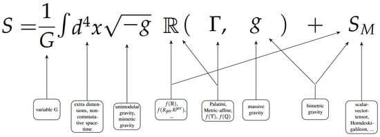 Considering that the reader might be overwhelmed by the multitude of extensions and generalizations of general relativity, we aim to summarize our point and make an attempt to schematize such a variety of modifications as changes of a particular element of the Einstein–Hilbert Lagrangian. As shown in Figure 1, some modifications can be associated with more than one element of the Lagrangian. This indicates that for some alternative theories, for instance such as gravity, the nonlinear deformations can be mathematically (and possibly physically) interpreted as a matter content. Some analogous diagrams occasionally appear in the literature [10,42]. Although sometimes inaccurate or misleading, they can be regarded as faithful attempts to expose the rich variety of theories, but they lack a genuine effort to understand the physics behind them. Certainly, our scheme in Figure 1 is highly incomplete and biased towards our research interests and limited knowledge, and it does not include some more radical generalizations, like Finsler geometry, which are hard to relate to some particular part of the EH action.