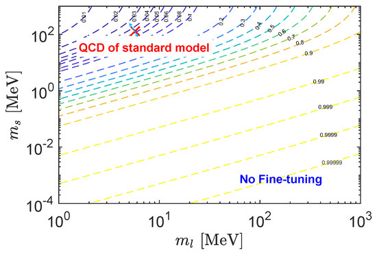 The proposed new fine-tuning problem is present at the scale only around the order of 1 GeV. When the electroweak symmetry becomes manifest at higher scales, the fine-tuning problem will be obscure. This is because the global chiral and axial symmetries are explicitly broken by the electroweak interactions as well as quark masses (or Yukawa couplings between the Higgs and quarks). In that case, the key Equation (1) will be modified involving the electroweak “topological” susceptibilities. Also at scales , the fine-tuning will be nontransparent due to the decoupling of pions, which is the most dominant source to generate the big gap between and . Thus, the new fine-tuning problem needs to be solved by a new physics with the scale in a range of 1 GeV.
