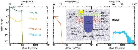 Stopping power spectra for each possible type of H2O recoil, in the original snowball setup, for tested sources. Corresponding initial species Es for which this is the mean are along upper x-axes. Plots are, from left to right: e−, p+ (hydrogen), and oxygen recoils, in green or yellow, orange, and cyan, respectively. A ∼100 MeV/cm threshold, a natural assumption as explained later in the text, explains a lack of discernible response from a source (diamonds and line near 100 Hz at upper left in the first pane). Lines are not fits but guides; errors are only bin widths (in x) or statistical (y). (Inset) G4 geometry: cross-sectional view. Steel flanges blocked s, but ethanol moderated neutrons.