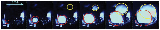 Images of the crystallization process: 20 mL of supercooled water (primarily black) turning into light-scattering snow (light blue, lit by blue LED) inside a quartz tube. This corresponds to a double nucleation from neutron data, likely due to multiple scattering. To the best of our knowledge, this was the first time multiple nucleation sites were observed within one sample, in the same image or adjacent frames. Circles mark software detections. Unlike with superheating, nucleations are slow here [27]. There are 150 ms between the frames depicted. The setup was similar to that of the COUPP 15 kg bubble chamber, with lighting orthogonal to camera line of sight [28]. Image artifacts included glare, reflections including off the thermocouples on the quartz wall, the wall itself, or the water line, and/or bubbles/dust within the circulating ethyl alcohol surrounding the TGP quartz.