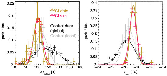 The control data could not be modeled effectively, so only the sim comparison with 252Cf is presented. It is not knowable what fraction of control events was due to residual particulate impurities on the order of the critical radius in size and/or wall/surface events (there was no 3D position information, given only one camera), and what fraction due to normal background radiation in the laboratory on the surface, including cosmic muon-induced neutrons. Thus, the control points could only be crudely subtracted. They created another source of systematic uncertainty. As it currently stands, our best fit to the mean time spent active by the water in 252Cf’s presence, 106.1 ± 2.0 s (data), is 108.3 ± 0.9 s (sim). The s agree as well: −18.62 ± 0.08 °C (data), −18.60 ± 0.03 °C (sim). (The errors on the simulated quantities are of course smaller, since the statistics can be increased arbitrarily). Not only the centroids, but the widths are reproduced, and even some of the non-Gaussian skewness, most evident below 50 s in Figure 4 left, although systematics from the G4 version and library choices do exist, so we only claim the threshold E is O(keV).