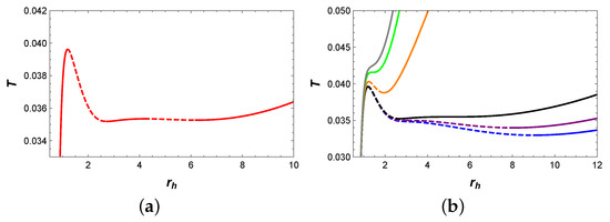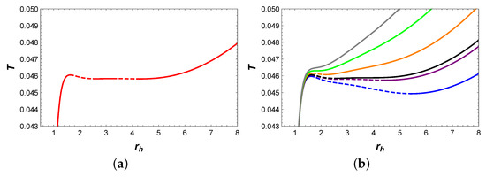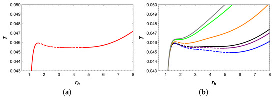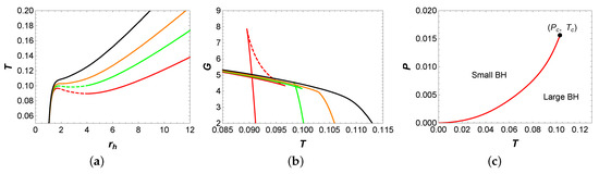 The behaviors of temperature T with respect to horizon radius and Gibbs free energy G with respect to temperature T are plotted in Figure 1a,b, respectively. It should be noted that isobaric curves of the same color in (a) and (b) correspond to same pressure values. In Figure 1a, when , two extremal points appear on the isobaric curves (represented by red and green), which divide these two curves into three branches: the stable small BH branch, the unstable intermediate BH branch, and the stable large BH branch. Among them, stable branches are represented by solid curves with a positive value of , while unstable branches are represented by dashed curves with a negative value of . When , there is no extremal point on the isobaric curve, and T increases monotonically with .