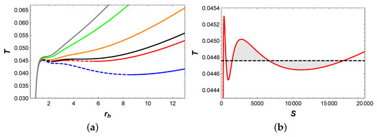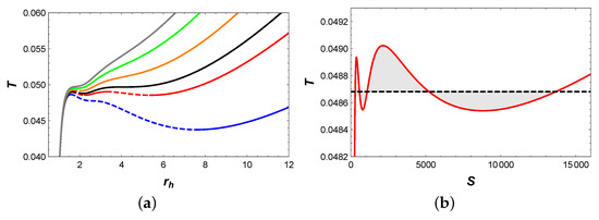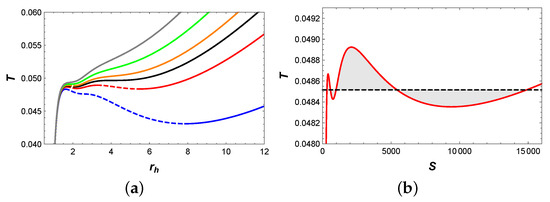 Firstly, we focus on the behavior of temperature, as shown in Figure 2a. When , two extremal points appear on the blue isobaric curve, which divide it into three branches: the stable small BH branch, the unstable intermediate BH branch, and the stable large BH branch. Interestingly, when , four extremal points emerged on the red isobaric curve, which divide it into five branches: the stable small BH branch, the unstable small BH branch, the stable intermediate BH branch, the unstable large BH branch, and the stable large BH branch. For , it is easy to utilize Maxwell equal area laws to construct two pairs of equal area regions in the diagram, as illustrated in Figure 2b. These two pairs of regions have the same temperature, i.e., . This implies that the BH undergoes two phase transitions simultaneously at such pressure and temperature. In fact, this result indicates the existence of a triple point, where small, intermediate, and large BH phases can coexist. When P increases to , the BH system undergoes a second-order BH phase transition. For , two extremal points on the orange isobaric curve divide it into three branches: the stable small BH branch, the unstable intermediate BH branch, and the stable intermediate BH branch. Moreover, the first-order phase transition turns to a second-order phase transition as P approaches to . When , the temperature T increases monotonically with , which implies that there is only one BH branch.