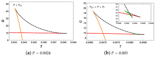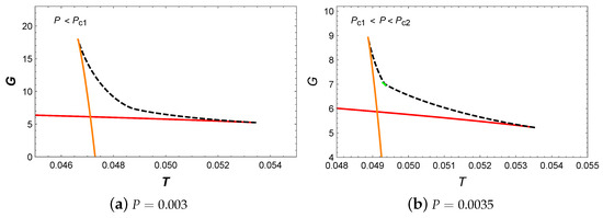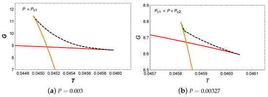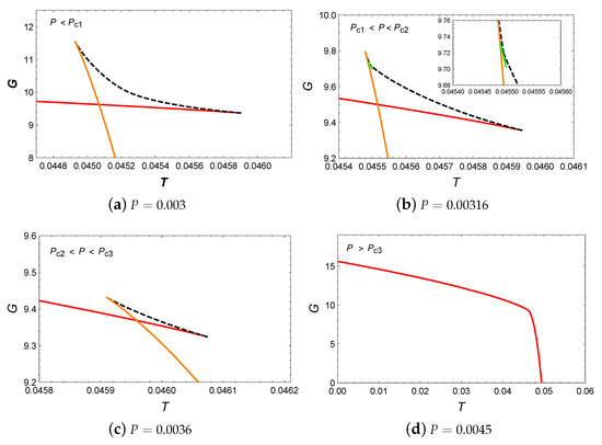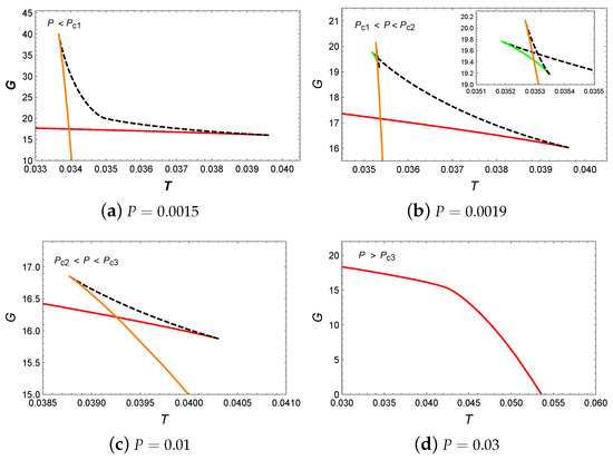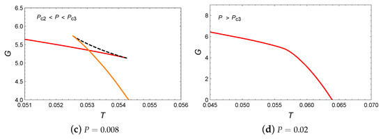 Next, let us analyze the behavior of Gibbs free energy G with respect to T. When , the appearance of a swallowtail in Figure 6a actually indicates the small/large BH phase transition. When the pressure increased to , two swallowtails can be observed in Figure 6b. However, the intermediate BH branch is suppressed by the BH branches with lower Gibbs free energy and does not participate in the phase transition. Therefore, in this pressure range, only the small/large BH phase transition occurs. For , the presence of a swallowtail indicates the occurrence of the small/large BH phase transition. When , the monotonic decrease in Gibbs free energy suggests that no phase transition occurs in the system.