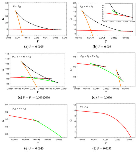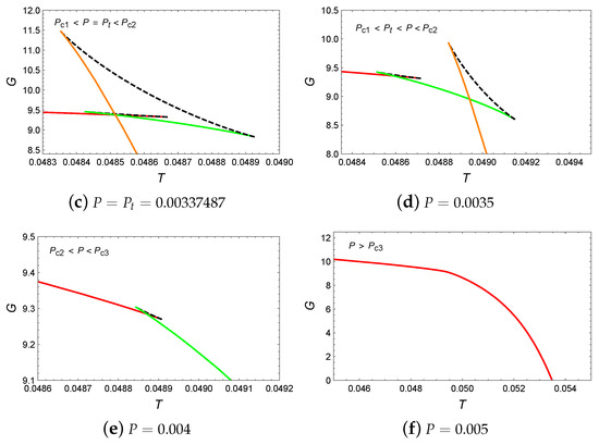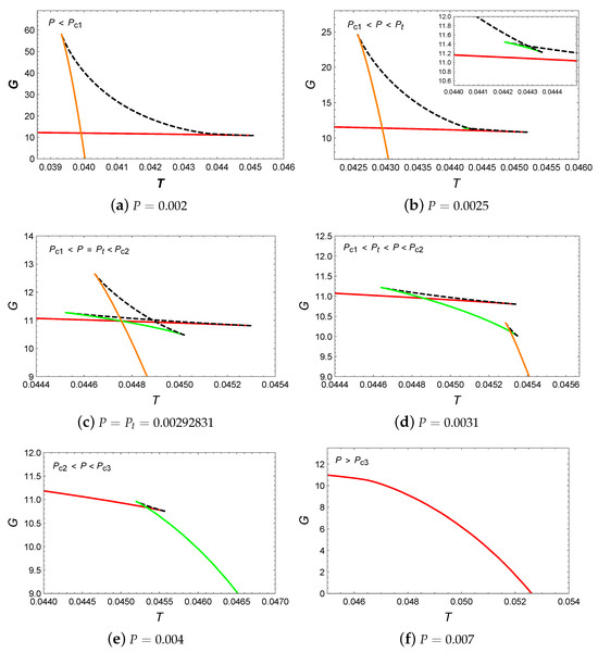We have plotted the behavior of Gibbs free energy G with respect to temperature T, as shown in Figure 3. When , a swallowtail appears in the diagram, which indicates a small/large BH phase transition. As the pressure increased to , two swallowtails appear in Figure 3b, which suggests the potential existence of two BH phase transitions. However, the intermediate BH branch is suppressed by the lower free energy branch and does not participate in the phase transition. Therefore, in this case, only the small/large BH phase transition occurs. Increasing the pressure to , it can be discovered that the intersection points of two swallowtails appear at the same point, which suggests the occurrence of small/intermediate/large BH phase transitions. For , two swallowtails can be observed, and all BH branches can participate in the phase transitions. This indicates that in this case, the system can undergo small/intermediate and intermediate/large BH phase transitions simultaneously. When the pressure is increased to , one swallowtail can be noticed, which implies that there exists only one small/intermediate BH phase transition. When , the Gibbs free energy decreases monotonically with temperature, which indicates that no phase transition occurs in the system.