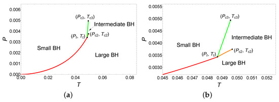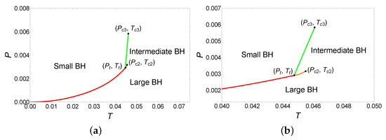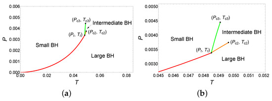 The phase diagram is illustrated in Figure 4, where Figure 4b is a local magnification near the triple point. As can be seen from the phase diagram, the system undergoes the small/large BH phase transition at . Interestingly, at the triple point (), the small, intermediate, and large BHs phases coexist, and the system undergoes the small/intermediate/large BH phase transitions. When , the small/intermediate and intermediate/large BH phase transitions appear simultaneously. When the pressure increases to , the system undergoes only the small/intermediate BH phase transition. In summary, these results suggest the presence of a rich variety of phase transition types in this parameter region.