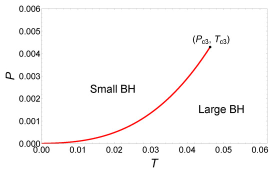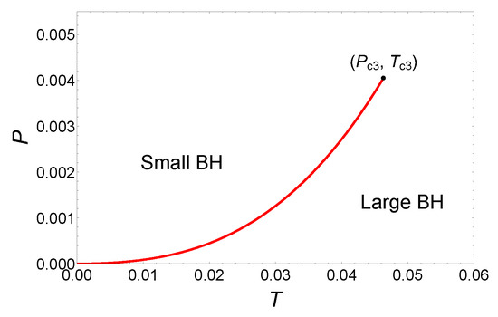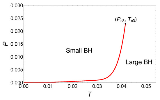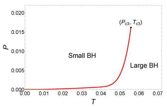 Finally, the phase diagram is illustrated as shown in Figure 7. The coexistence curve originates from the origin and terminates at the critical point . From the phase diagram, it is evident that while there are three critical points in this parameter region, only the small/large BH phase transitions occur.