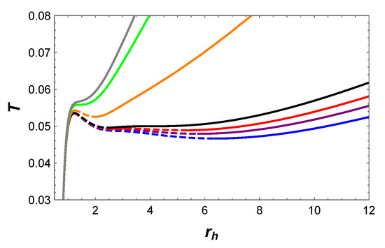 Firstly, we would like to analyze the behavior of temperature T with respect to , as shown in Figure 5. When , two extremal points appear on the blue isobaric curve, which divide it into three branches: the stable small BH branch, the unstable intermediate BH branch, and the stable large BH branch. As the pressure increases to , the red isobaric curve is divided into five branches by four extremal points: the stable small BH branch, the unstable small BH branch, the stable intermediate BH branch, the unstable large BH branch, and the stable large BH branch. For , there are two extremal points on the orange isobaric curve, which suggests the existence of three BH branches. When the pressure increases to , the temperature increases monotonically with , which implies that there is only one BH branch.
