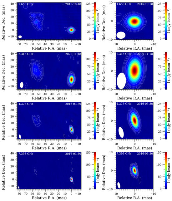 Besides the compact core, an inner jet pointing towards the east can be seen in the zoomed-in higher-frequency images that provide sufficiently high angular resolution. In turn, an extended, diffuse emission region ∼60 mas east–northeast of the core is apparent in the wide field of the lower-frequency images that are more sensitive to the extended steep-spectrum emission. This region corresponds to the components designated with J1 and J2 in the earlier 1.6 GHz VSOP image [39] and can be traced here up to 8 GHz frequency (Figure 1).