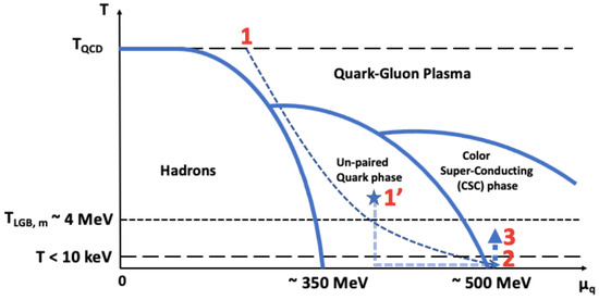The QCD phase diagram is complex (e.g., [17,18,19]), and in principle, one cannot exclude the existence of a CSC phase where gluon condensation would yield electromagnetically unstable X “particles” (here LGBs), as required in our model. Figure 2 shows a hypothetical phase diagram with the dashed line depicting a possible trajectory leading a quark cluster from its state at birth (in an unpaired phase) to the CSC phase. We require an unpaired phase at chemical potential , which bridges the hadronic phase and the CSC phase. That is, the CSC phase is accessed, at low T, from a low-density unpaired phase with a first-order line separating the two phases. Once in the CSC phase, a cluster becomes a SQC and produces LGBs in the radiation-dominated post-BBN epoch at keV temperatures.