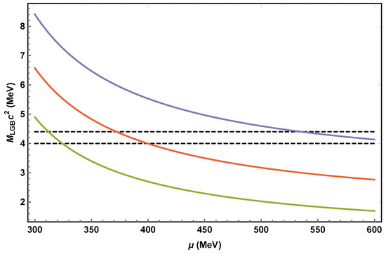 LGB mass versus quark chemical potential () for MeV (the scalar parameter of QCD; see Section 2.1 and Appendix C for details). The curves from top to bottom are for , respectively. The two dashed lines show the range yielding a mono-chromatic photon line in the range. Using MeV, expected using the usual renormalization scheme with 3 quark flavors, we obtain MeV for (see Equation (A6)).