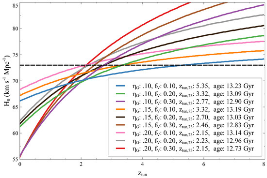 The Hubble constant as a function of (the leakage characteristic redshift) in our model for different values of and . The km s−1 Mpc−1 value is shown as the horizontal line. The resulting age of the universe is shown for each case and is younger than the CDM universe.