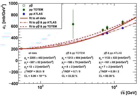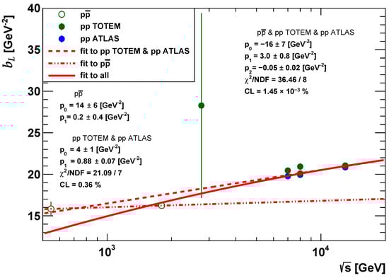 The values of the parameter for data lie on the line given by Equation (22) with the parameters GeV−2 and GeV−2. These values are significantly different from the values of linearity for elastic collisions, GeV−2 and GeV−2. The fit for the parameter values of all data—, ATLAS, and TOTEM—even by the quadratic parametrization Equation (21) is statistically not acceptable, as it has too small of a confidence level of .