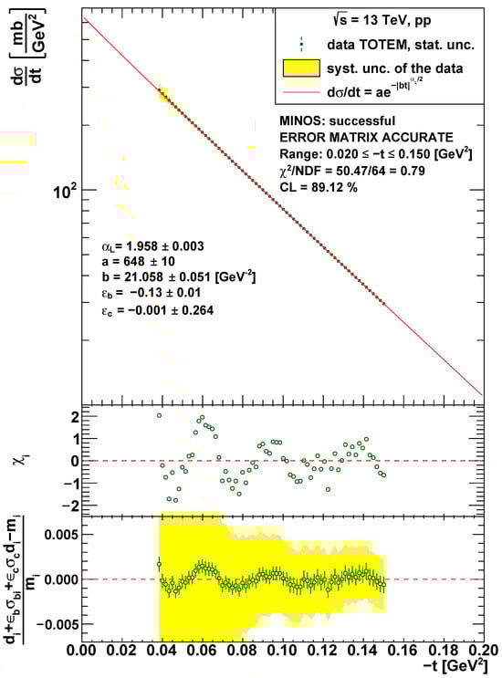 Fit to the low- differential cross section data measured by TOTEM at 13 TeV [], with the SL model defined by Equation (2). The differential cross section data with the fitted model curve as well as the values of the fit parameters and the fit statistics are shown in the top panel. The middle panel shows the values corresponding to the data points . The bottom panel shows the relative deviation between , the data points shifted within errors by the correlation parameters of the definition Equation (18), and , the values calculated from the model.