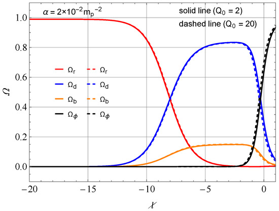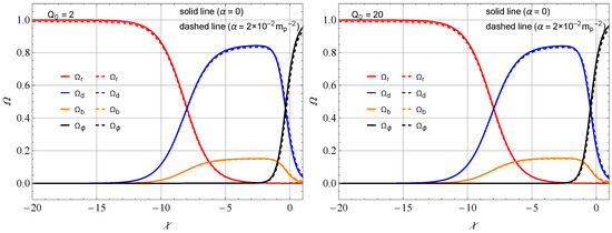 The graphs in Figure 2 (left panel) and Figure 2 (right panel) are similar to each other; however, in Figure 2 (right panel), we set and adjust for two values as in Figure 2 (left panel). Comparing these graphs with Figure 1, we can observe that the increase in has minimal influence on the radiation , dark matter and baryonic components. However, for the dilaton component , we note that there is a more pronounced rise in the respective evolution curve.