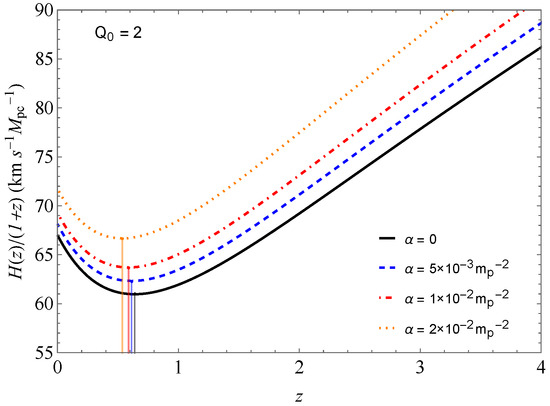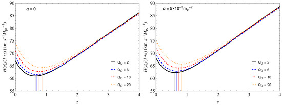 The graph in Figure 3 expresses the behavior of the Hubble parameter as a function of redshift z, where we fixed and explored different values for . In this case, we can observe that in all values admitted for we have a decay followed by an increase. Note that the minimum point of each curve has a redshift z that decreases with the increase in , that is, for , , and , we have , , and , respectively. On the other hand, the values of the Hubble parameter at , i.e., increases with the growth of , assuming values between km s−1 Mpc−1 and km s−1 Mpc−1.