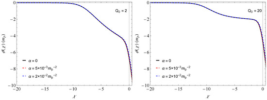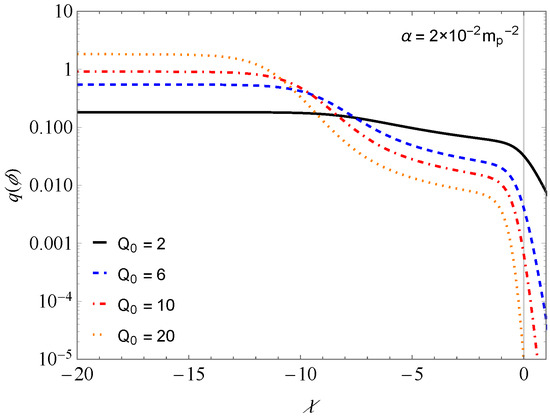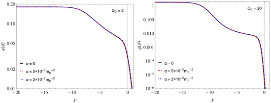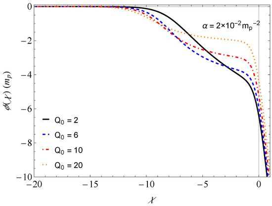 We can solve the set of Equations (34)–(37) by numerical methods with Equation (32) as a constraint on the initial dataset. Here, we also recover the factor, which can be given in terms of the Planck mass GeV. We shall use a potential of the form (31), by assuming , as well as the Formula (30) with for different values of the charge .