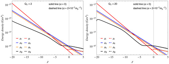 Furthermore, in relation to the dilaton component (right panel), it presents a more pronounced decay when compared to the graph in (left panel), that is, has a more significant decay with the increase . For the points of intersection between and the other components, we will have the same values corresponding to ; however, such points occur at a lower energy density when compared to the graph in (left panel).