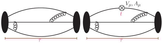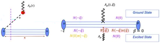The fact that there is an enhancement of the ME in the axial channel has been understood for over 60 years as the “pion pole dominance” (PPD) hypothesis. On the lattice, the creation of a state by is suppressed by the 3D volume compared to just the nucleon, as each state has a normalization factor of for a point (local) source . The axial current can, however, couple to this pion, and because the pion is light, this coupling can occur anywhere in the time slice at which the current is inserted with momentum (see Figure 4 (left)). This gives a factor of V enhancement, thus approximately canceling the normalization factor [36,37]. Thus, the ME obtains an enhanced contribution that is an artifact to be removed when the the pion comes on shell. Note that since energy is not conserved on the lattice, both the neutron and the pion can come on shell, however, since momentum is conserved, and possible excited states must have the same total momentum as the neutron state. PPD tells us that the axial current with momentum can be viewed as the insertion of a pion with , and this has a large coupling to the nucleon. These processes are illustrated in Figure 4.