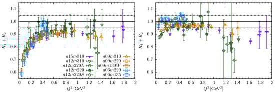 A major challenge in the analysis of all nucleon correlators is that the signal-to-noise ratio decays exponentially as with the source–sink separation [33,34]. In current calculations ( measurements), a good signal in and extends to ≈2 and ≈1.5 fm, respectively.