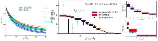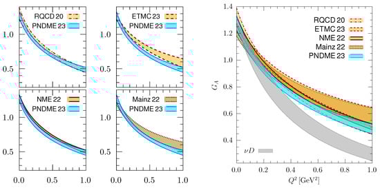 The plots in Figure 7 provide two comparisons. In the panels on the left, the physical point results from the RQCD [24,29], ETMC [23], NME [27], and Mainz [26] collaborations are compared against those from the PNDME [19]. On the right, they are overlaid and compared to the phenomenological extraction from the old neutrino–deuterium bubble chamber data [20]. The PNDME, RQCD, and NME data mostly overlap, whereas the ETMC and Mainz data overlap and fall off slower for GeV2. On the other hand, the neutrino–deuterium (D) data [20] fall off much faster for GeV2. Overall, as shown in the right plot, the five lattice QCD estimates are consistent within and lie about above the D band for GeV2.